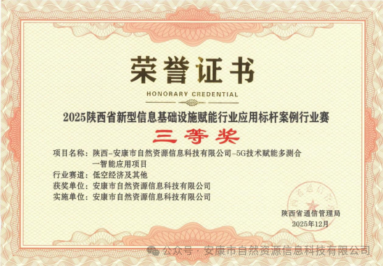 近日,由陕西省通信管理局等多部门组织开展的 “2025 陕西省新型基础设施赋能行业应用标杆项目” 评选结果公布,安康市自然资源信息科技有限公司申报的 “5G 技术赋能多测合一智能应用项目” 成功获评低空经济赛道三等奖。
